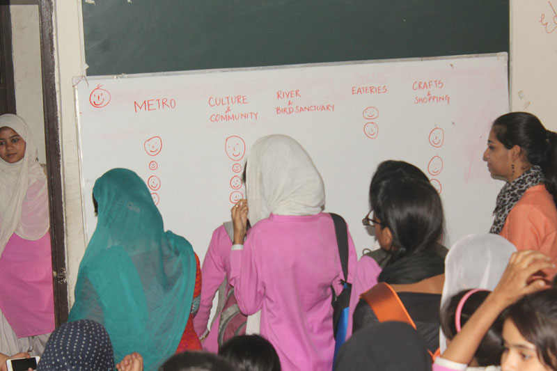 The participants were surprised to know about Okhla’s rich natural and cultural heritage. What was most exciting for them was learning to read maps on their own – finding their way from home to school, identifying important landmarks and nodes and marking favourite spots and those areas which they felt were unsafe due to heavy traffic and bad roads or eve-teasing. In another session the participants were divided in groups to discuss issues which affect their household directly and are most pertinent to their area – congestion, solid waste, and erratic water supply were the main issues that came up.